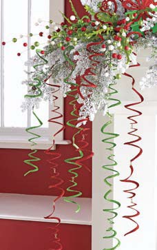 This decoration from the Christmas Scoops collection of RAZ uses lime green and red acanthus leaf sprays. The green glittered leaves add more color. Long dangling glittered spiral sprays fall on down toward the floor. This arrangement is good for a newel post also.The acanthus leaf spray is one of our most popular RAZ sprays at Trendy Tree. Classic red, green and white with the addition of sparkling glitter and a few leaves. Very versatile.